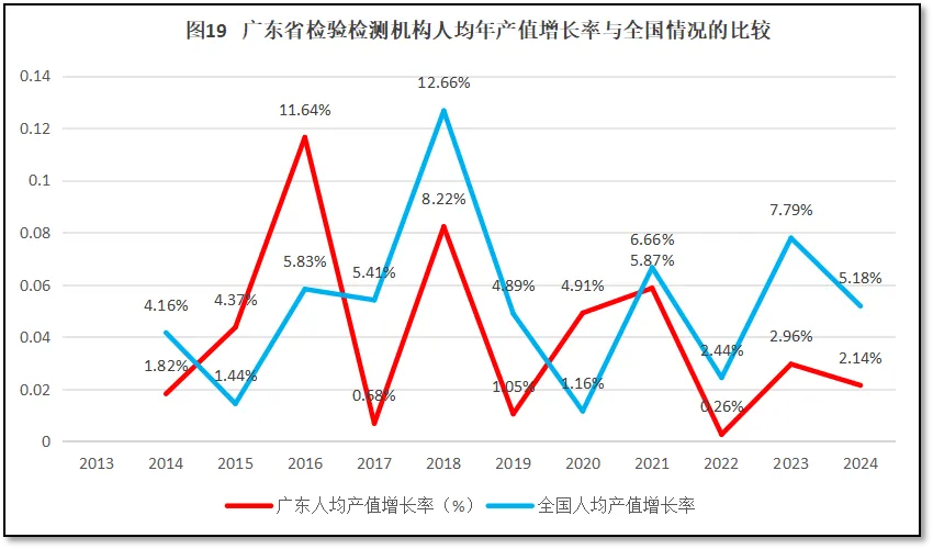 再来看河南省检验检测机构人均年产值增长率与全国人均年产值增长率的比较,如图19所示。
