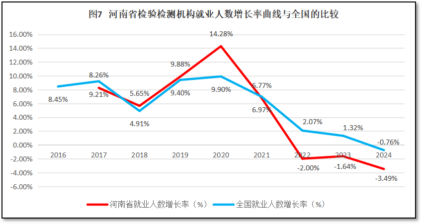 河南省检验检测机构就业人数增长率曲线与全国检验检测机构就业人数增长率曲线的比较,如图7所示。